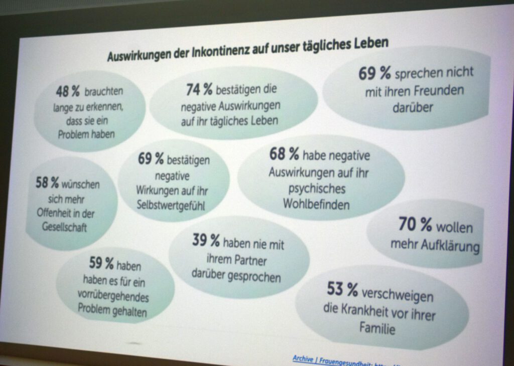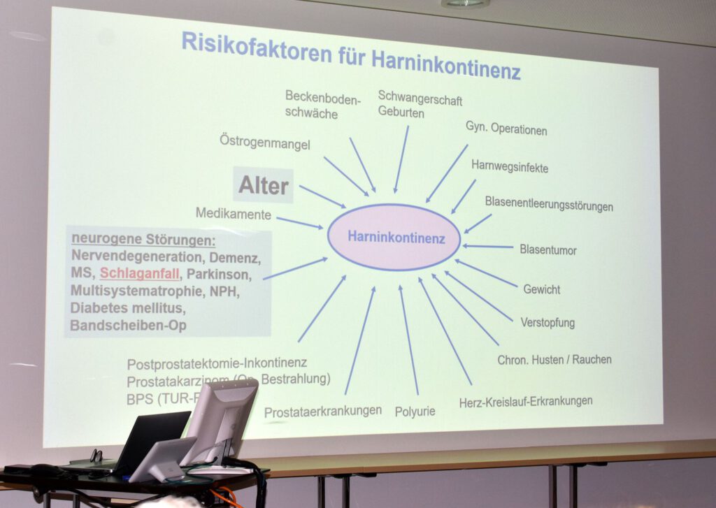 Frau Prof. Dr. Daniela Schultz-Lampel: „Blasenstörungen können durch natürliche Alterungsprozesse, aber auch aufgrund neurologischer Ursachen auftreten. Nerven steuern die Blase. Sind bei Schlaganfall, Parkinson und Demenz diese Regionen im Gehirn betroffen, kann das zu Kontrollverlusten führen. Obwohl es so viele Menschen betrifft, ist das Thema das Aschenputtel der Gesundheitsprobleme, weil sich viele schämen, es ist ein Tabu-Thema. Man geht deswegen nicht gern zum Arzt. Man bedenke: etwa ein Drittel aller Frauen sind betroffen, etwa ein Viertel der Männer, damit ist Inkontinenz eine sogenannte Volkskrankheit. Dabei ist die Harninkontinenz – das Unvermögen den Urin zu halten – eine Erkrankung nicht nur im Alter.“