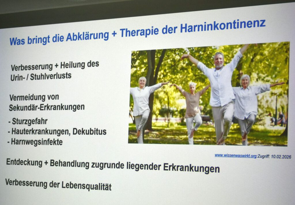 Prof. Schultz-Lampel: „Harninkontinenz gehört zu den häufigsten Störungen, die die Lebensqualität beeinträchtigen, das soziale Leben, das Intimleben, das Partnerleben. Inkontinenz kann viele Folgestörungen auslösen: offenes Steißbein, Hautinfektionen, Infektionen der Blase und Harnwege, häufiges nächtliches Wasserlassen bewirkt Konzentrationsmangel, Müdigkeit und die Gefahr von Stürzen und damit zu Knochenbrüchen steigt. Wir unterscheiden die Belastungsinkontinenz (der Schließmuskel ist schwach) und die Dranginkontinenz (die Blase kann nicht mehr richtig speichern), aber es gibt auch die Kombination von beiden. Bei Frauen ist die Belastungsinkontinenz typisch, sie tritt auf beim Husten, Niesen und Lachen nach Schwangerschaften und Geburten, bei Männern ist die Dranginkontinenz typisch, oft durch die Prostata bedingt.“