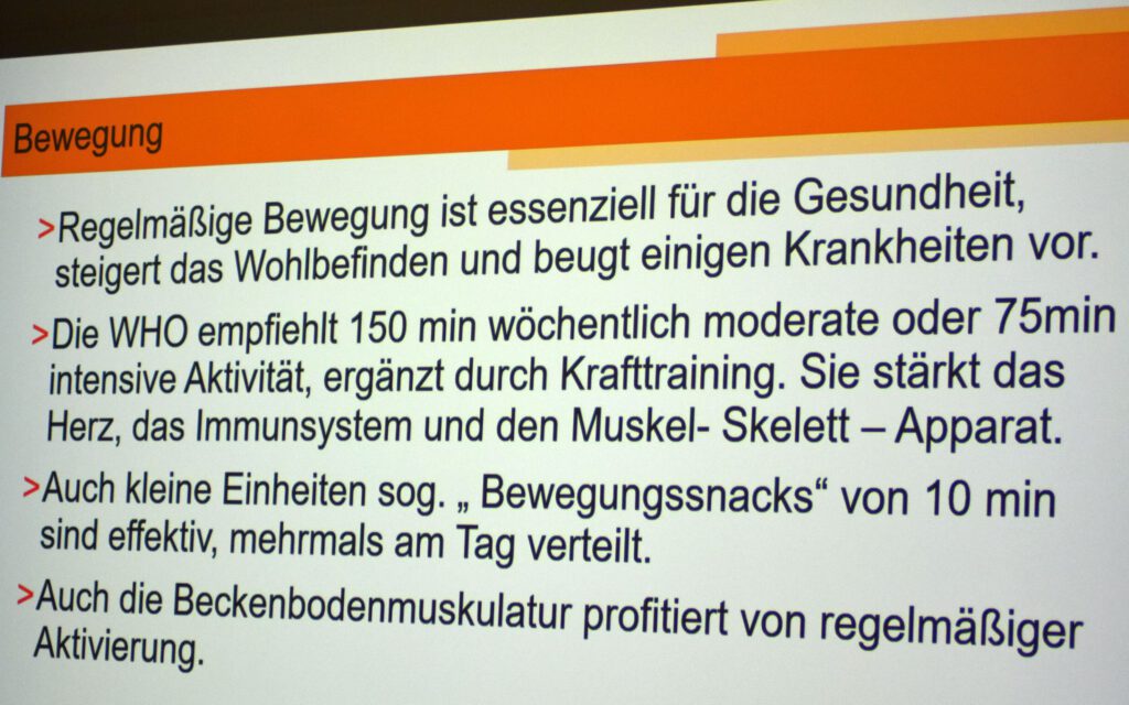 Die Physiotherapeutin und Beckenbodentherapeutin Melanie Eisele: „Bewegung ist essentiell für die Gesundheit, steigert das Wohlbefinden und beugt vielen Krankheiten vor. Die WHO empfiehlt 150 Minuten wöchentlich moderate Aktivität, ergänzt durch Krafttraining. Aktivität stärkt das Herz, das Immunsystem und den Muskel-Skelett-Apparat. Mehrere Bewegungssnacks von 10 Minuten sind ein guter Anfang.“ Zum Thema Beckenbodentraining, von dem die meisten schon gehört haben gab es einen kleinen anatomischen Exkurs: Der Beckenboden besteht aus vielen Muskeln – das knöcherne Becken wird von unten muskulär gestützt. Alle inneren Organe liegen auf der Beckenbodenmuskulatur. Das sind so ca. 9 kg innere Organe plus Bauchfett, es könnte also bei manchem etwas mehr sein. Die Kooperation des Zwerchfells – verantwortlich für die Atmung – mit dem Beckenboden bedeutet: Beim Ausatmen hebt sich der Beckenboden, der die Funktion hat, die inneren Organe oben zu halten. Das bedeutet beim Ausatmen tun wir schon etwas Gutes für den Beckenboden. Tief Einatmen und dann richtig hörbar Ausatmen. Zwerchfell und Bauchmuskeln sind die Helfer beim Beckenbodentraining, ebenso die Rückenmuskulatur so hält der Beckenboden dem Druck stand.