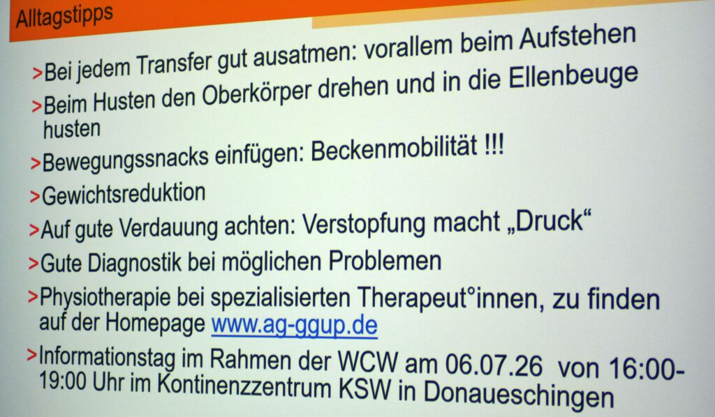 Es gab auch eine Einladung: Am 6. Juli von 16 – 19 Uhr findet in Donaueschingen im Schwarzwald-Baar Klinikum ein Kontinenztag unter dem Motto „Inkontinenz – sprich drüber. Sie fragen – unsere Experten antworten“ mit offener Sprechstunde statt. Es gibt Kurzvorträge und Einzelgespräche.