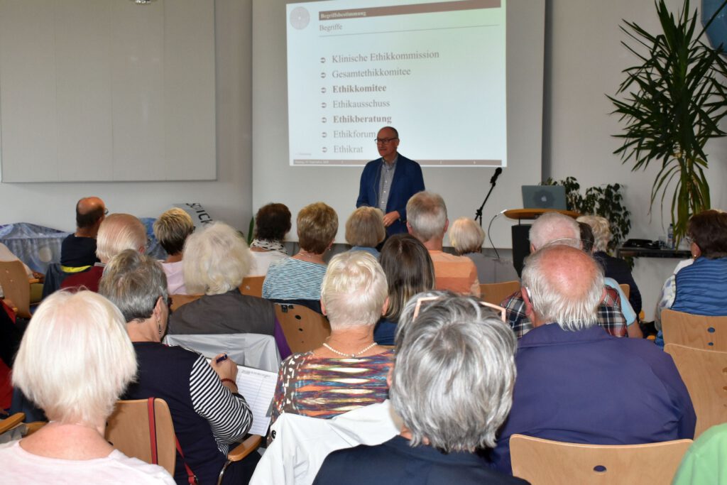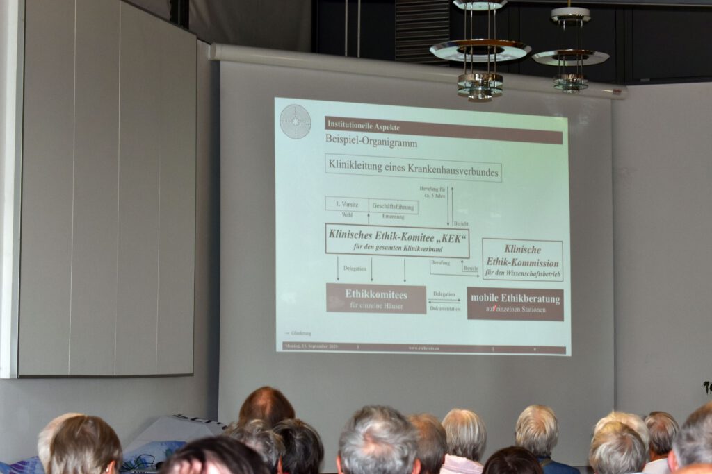 Ethische Aspekte kommen dann, wenn wir etwas gegeneinander abzuwägen haben. Wenn es unklar ist, ob der Patient noch nach diesem oder jenem Therapiekonzept behandelt werden will. Bei der Beratung geht es darum, nicht unbedingt schnell, sondern überlegt und begründet zu handeln“.An das Ethikkomitee können sich der Patient, die Angehörigen oder auch das medizinische Personal wenden, dann wenn ein Angehöriger meint, dass der Patient vielleicht nicht mehr oder nur eingeschränkt behandelt werden soll. Jetzt ist es die Aufgabe, ein klärendes Gespräch zu organisieren, dass innerhalb der nächsten 1 – 2 Tage stattfinden sollte. Von der Station sollten möglichst viele Fachbereiche vertreten sein, die den Patienten betreuen. Eingeladen werden der Stationsarzt, die Pflegekräfte, manchmal sind der Chefarzt, Ernährungsberater, Physiotherapeuten und die Krankengymnastik involviert.